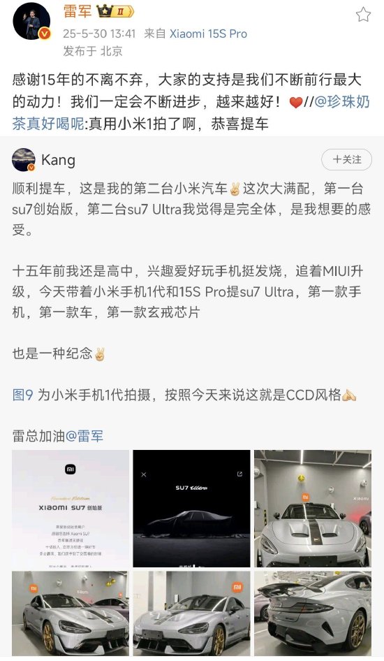 新浪科技讯 5月30日下午消息,有网友继su7创始版后,再提su7 Ultra,并表示“今天带着小米手机1代和15S Pro提su7 Ultra十大股票配资平台,第一款手机,第一款车,第一款玄戒芯片。”